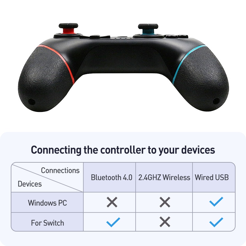 1. Use with Switch console 2. Dual Shock 3. With turbo function, Capture function, Home function. 4. With 0.7m charging cable 5. Two high quality analogue sticks come without any dead zone 6. Bluetooth version: 2.1+EDR 7. Built-in 3.7V/400mAh Li-ion battery, support 8 hours working time. 8. With sensor, no NFC, no awake-up function