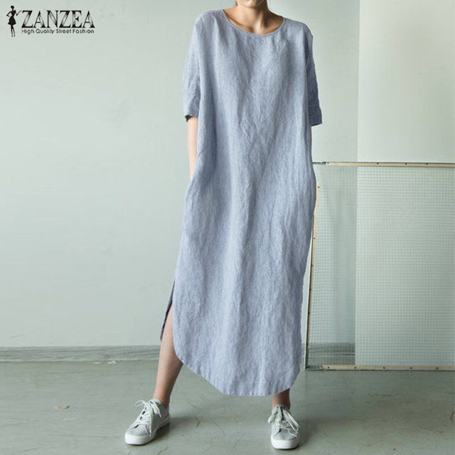 Material:100% Cotton Type:Dress Color:Gray Blue,Dark Grey,Off White Package include:1 Dress Product Detail: -Half Sleeve -O-Neck -Multi-color -Side Pockets -Mid-Calf Length -Loose Style