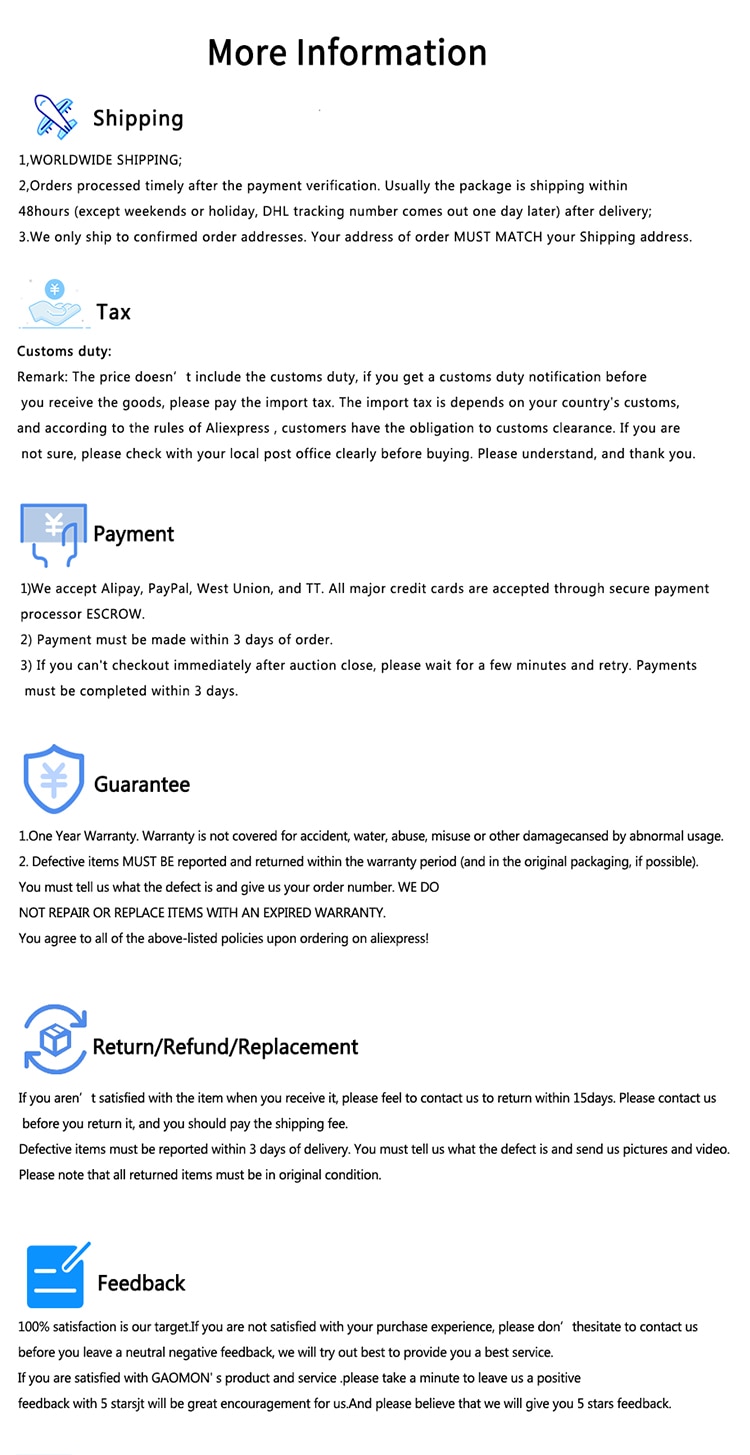 Warranty: 1 year warranty basing on non human made damages and accident damages