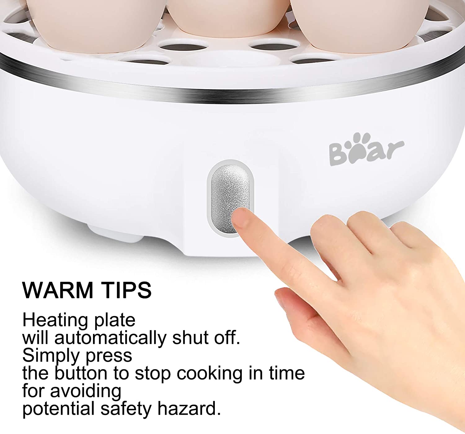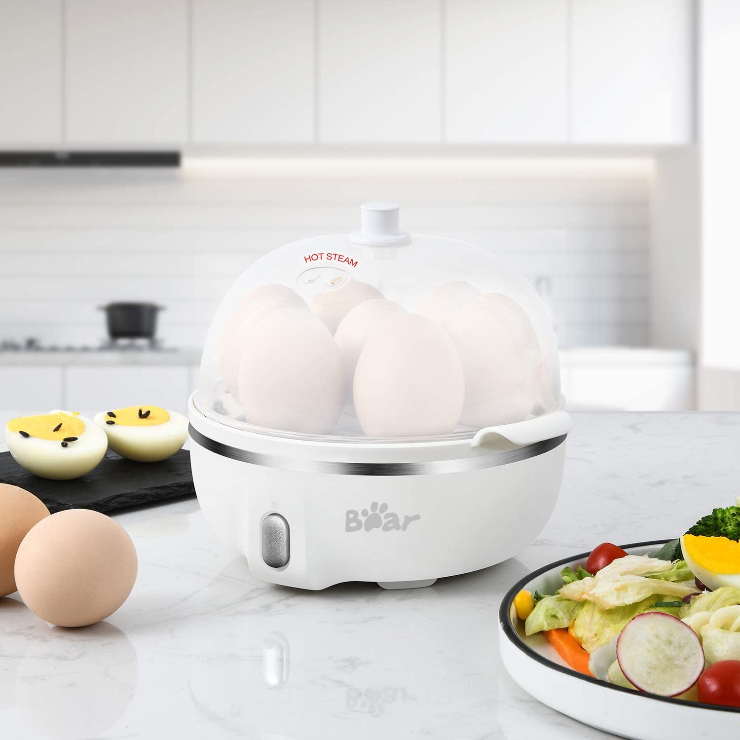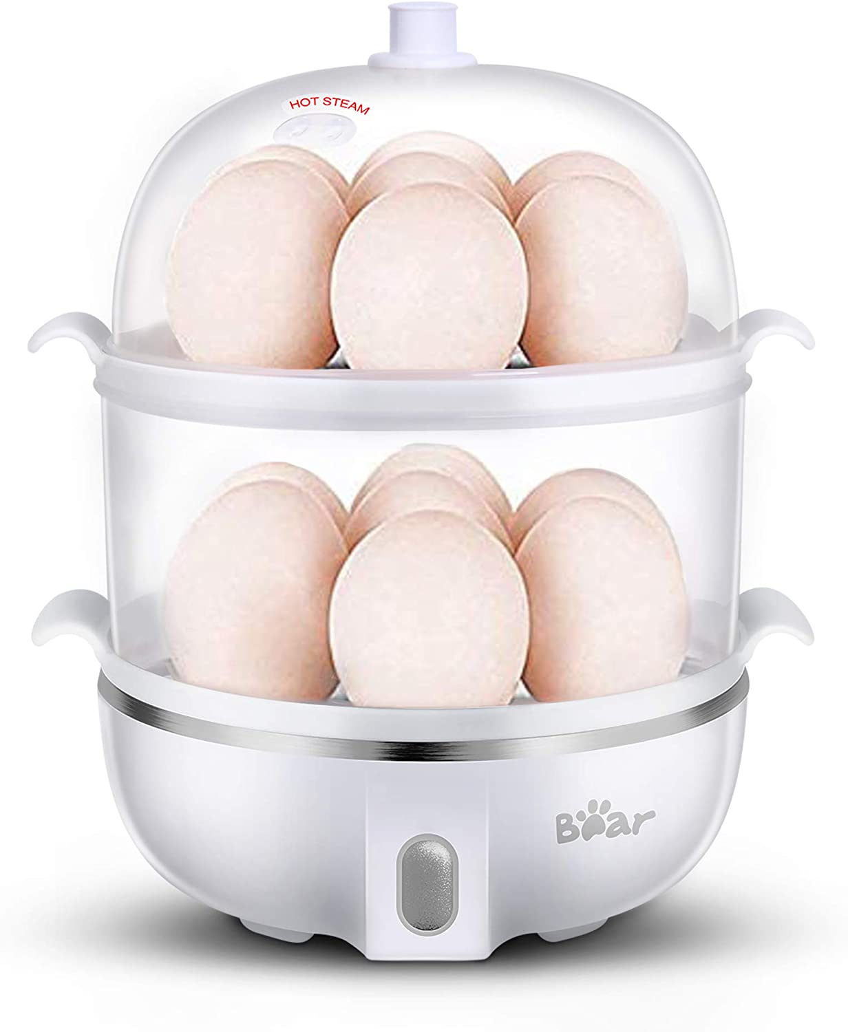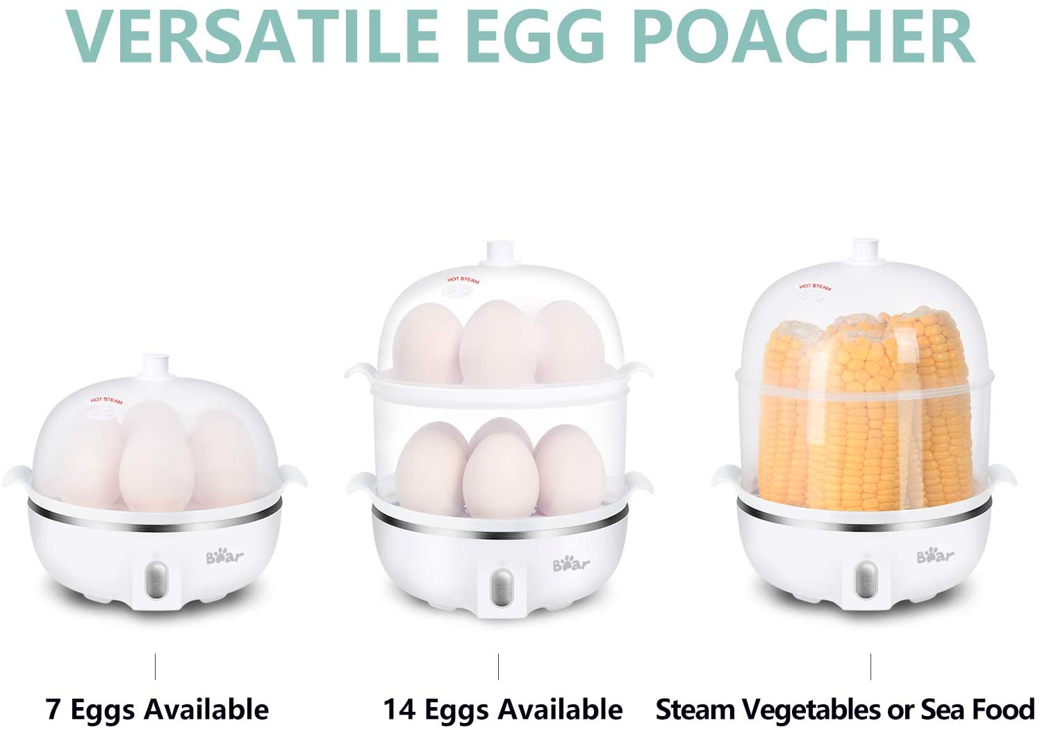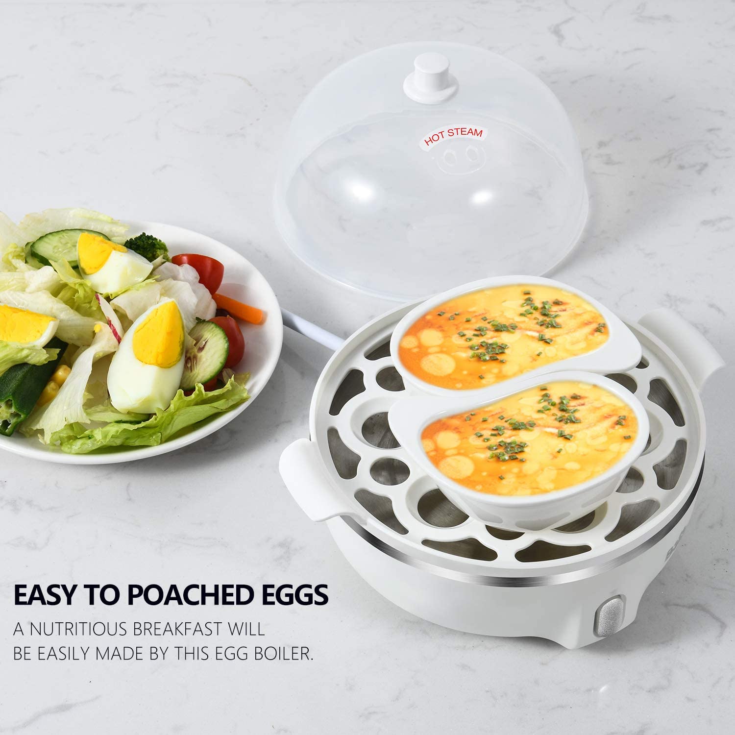 UPDATED MANUAL is improved, please contact us to receive the electronic file. LARGE 14 EGGS CAPACITY: Convenient to use single-layer 7 eggs or double-layer 14 eggs steaming rack to meet your demand. Eggs come out consistently perfect and the shell is easy to peel.VERSATILE FOR COOKER: This white egg cooker is ideal for hard or soft boiled eggs, poached eggs, scrambled eggs, individual omelets, steam vegetables and other food. Definitely an fast expert for the kitchen, college dorms, travel, and large party at breakfast or any time.