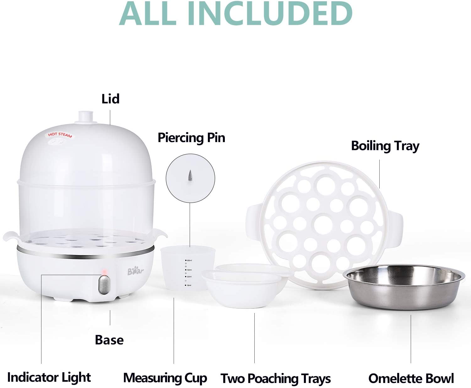 SERVICE AND SATISFACTION: Your satisfaction is our priority, we guarantee this electric egg maker! Any of questions will be solved in 24h. Package includes a stainless steel omelet tray, 2 plastic poaching trays, 2 plastic boiling trays, BPA FREE, measuring cup with piercer and manual.