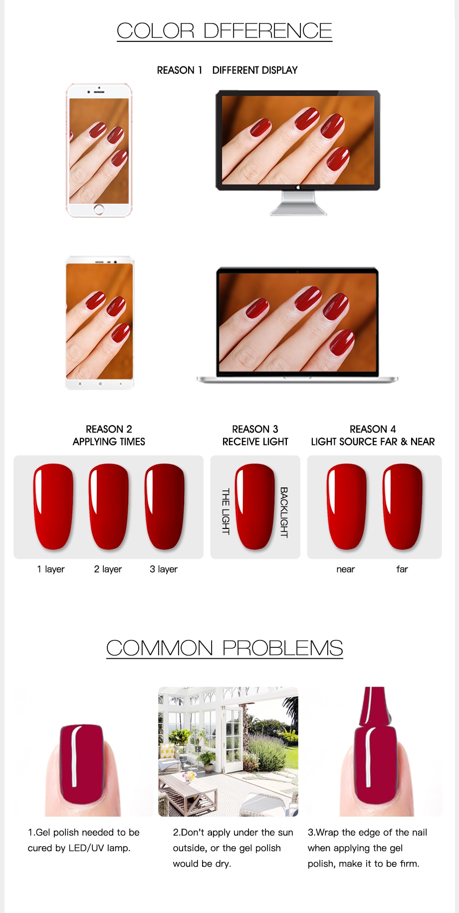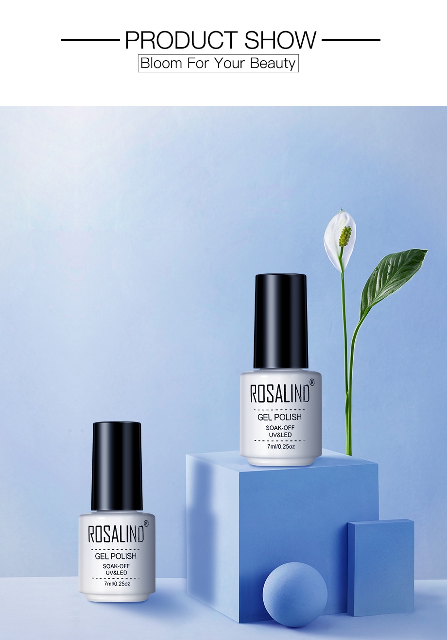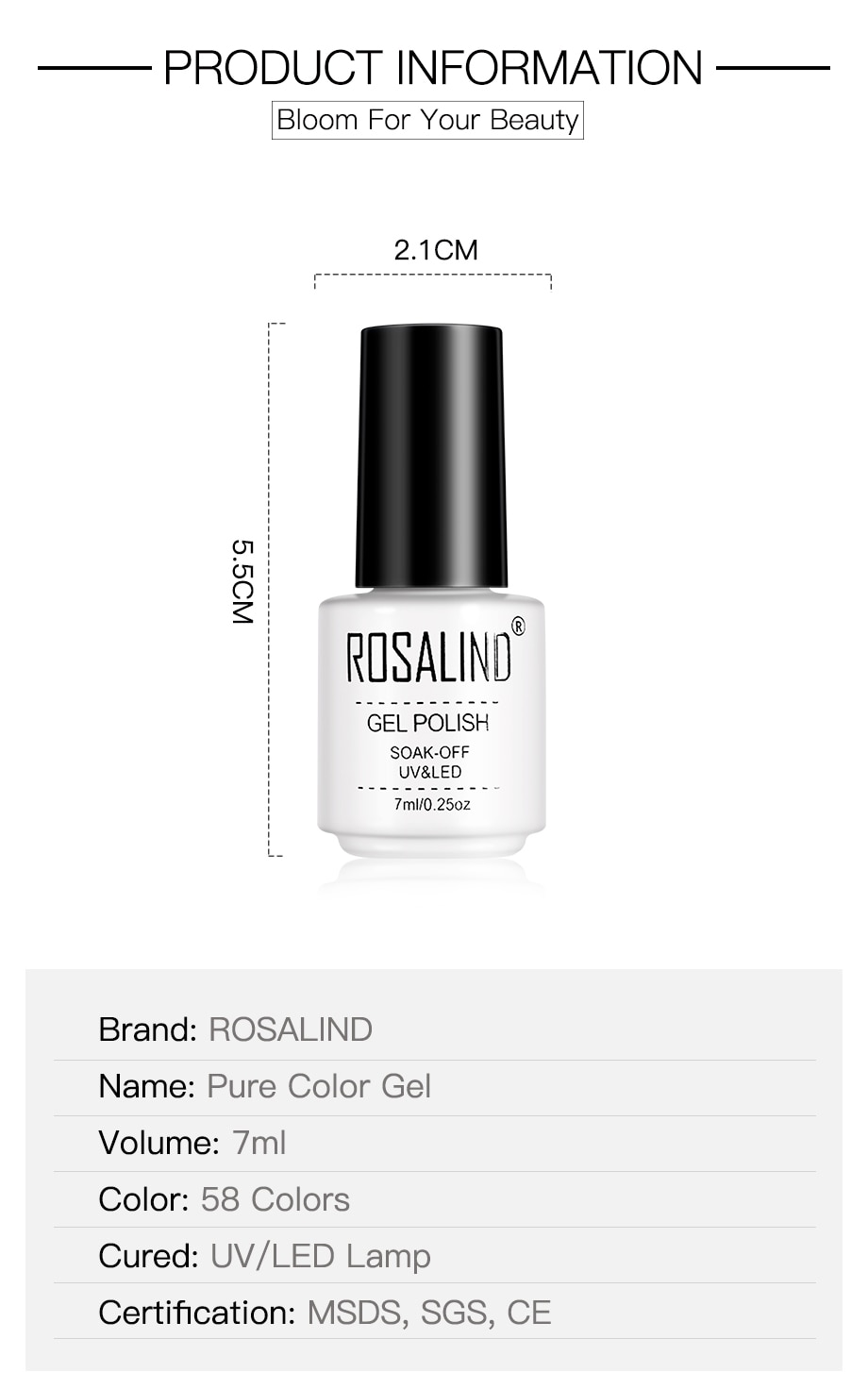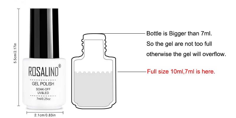 Three Steps to manicure by yourself: 1.-Shape nail surface, clean the cuticles, buffing nail surface and clean the dust. 2.-Apply ROSALIND BASE coat (Remember to seal the edge of the nail). Cure with LED lamp for 60 seconds or UV lamp for 2 minutes. 3.-Apply 1st layer of ROSALIND color coat. Cure with LED lamp for 60 seconds or UV lamp for 2 minutes. 4.-Apply more layer of color coat if color is not bright enough. 5.-Apply the ROSALIND TOP coat. Cure with LED lamp for 60 seconds or UV lamp for 2 minutes. 6.-Wipe the tacky residue on nails with the cleanser. Two Steps to remove: 1.-Soak off the nails into acrylic remover for about 5 minutes. 2.-Rip down the whole piece of nail enamel gently on each nail. Kindly reminder: 1.-The net weight is 7ML. But the capacity of the bottle is more than 7ML, Gel will not be fully filled in the bottle! 2.-Keep tightly sealed, keep out of sunlight, keep out of reach of children.