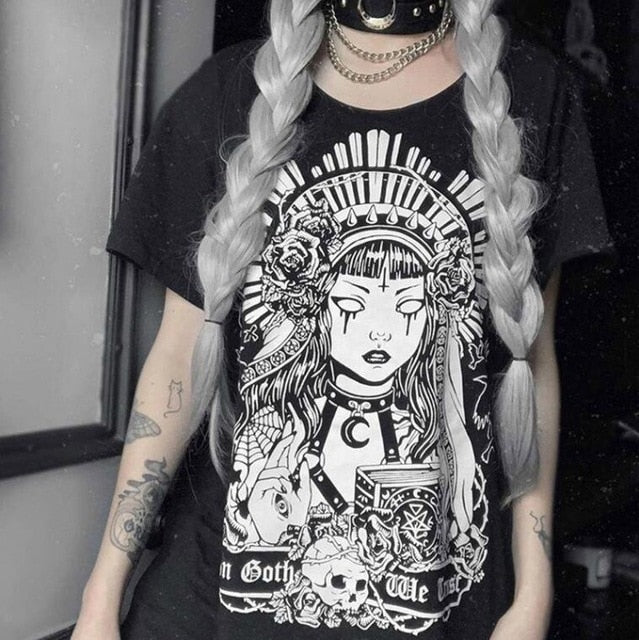 • 将图片加载到图库查看器,VIP HJN Japanese Style Floral Print Gothic T-Shirt Women's Grunge Aesthetic Pastel Goth T-shirts Edgy Fashion Tops